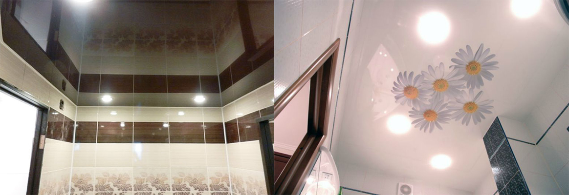 Многие дизайнеры рекомендуют устанавливать в ванной глянцевые либо бесшовные цветные полотна, повторяющие оттенки плитки или аксессуаров. В этом случае красиво обыгрывается цветовая палитра ванной. Хорошо смотрятся белые глянцевые потолки, что наглядно доказывают фото. Блестящий белый потолок визуально расширит ванную, сгладив «видимые» границы.